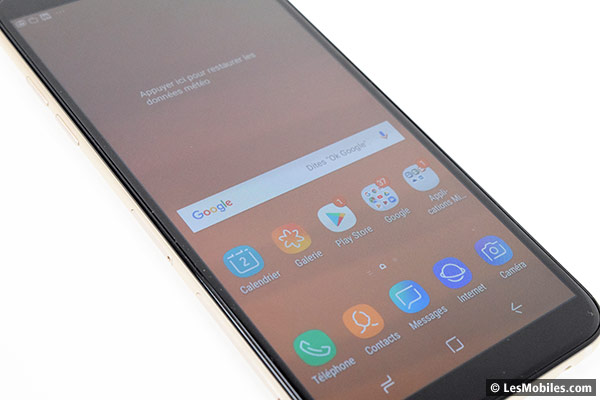 Les touches de navigation sont donc intégrées à l'interface. L?écran du Galaxy A6 est assez clair, avec un beau contraste (AMOLED oblige), mais la visibilité en plein jour n'est pas optimale, faute à une luminosité maximale un peu en retrait. Les couleurs sont généralement bien respectées (même si certains réglages à voir dans les paramètres améliorent l'affichage de certaines couleurs). Les angles de vision sont larges.