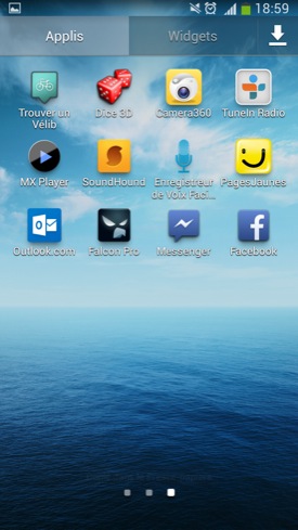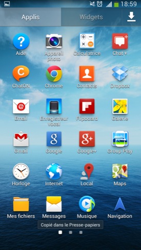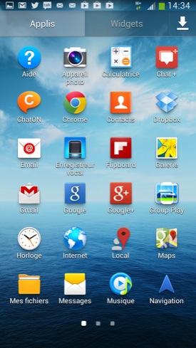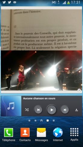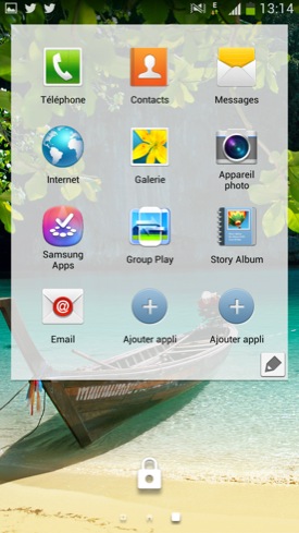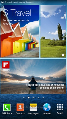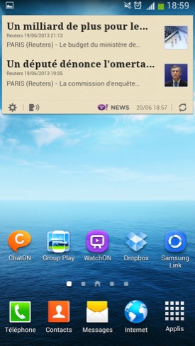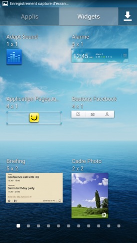 A côté de cela, le système est organisé en bureaux, sur lesquels vous pourrez mettre des icônes d'application ou des widgets. Ces derniers sont des applications dynamiques qui restent toujours ouvertes et s'actualisent soit automatiquement, soit quand vous les manipulez. Vous pourrez consulter d'un coup d'oeil vos réseaux sociaux, Facebook ou Twitter, ou utiliser l'un des nombreux widgets de Samsung. Météo dynamique, S Travel pour les recommandations de voyage, Galerie pour afficher vos photos sur vos bureaux, S Calendrier pour, comme son nom l'indique, avoir un calendrier sous les yeux très rapidement, Story Album pour de véritables albums photos que vous aurez créé au préalable... bref, tout y est. Ajoutez à cela les widgets partenaires comme Flipboard pour l'actualité, Yahoo! News pour les brèves et ceux de Google, comme la recherche ou Music et vous aurez un panel très complet.