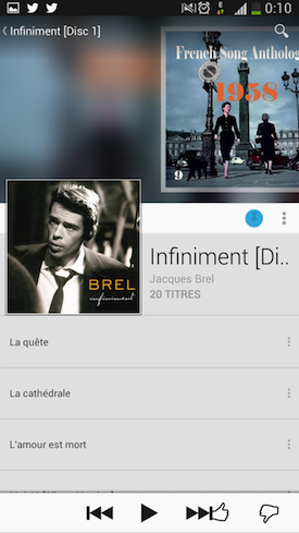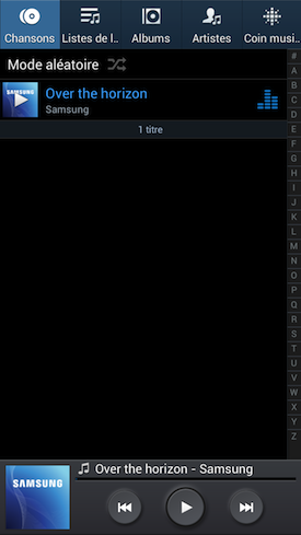 Côté musique, c'est dans la norme. Samsung n'a jamais fait d'effort pour intégrer des composants haut de gamme sur ces appareils à ce niveau-là et on sent bien qu'on n'est pas du tout à la hauteur d'un HTC One. Cela dit, si vous utilisez des services de streaming, vous ne devriez pas voir la différence. Google Music, par exemple, dans sa nouvelle version, joue parfaitement son rôle de lecteur audio à tout faire. Il vous proposera de télécharger vos morceaux dans les nuages pour les retrouver partout en déplacement, dans la limite de la couverture 3G. Avec une limite à 20 000 morceaux, vous aurez clairement le temps de voir venir. Notez qu'il faudra être américain pour profiter du service de streaming illimité à la Spotify ou Deezer. A côté du lecteur de Google, le lecteur de Samsung fait pâle figure, comme vous pouvez le voir ci-dessous.