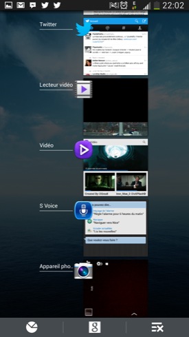 Le multitâche, standard depuis Android 4.0, s'active en appuyant longuement sur la touche « Home ». Samsung a gardé l'organisation d'Android nu : vos applications s'afficheront sur une barre défilante de haut en bas. Un double appui lancera la recherche vocale par Samsung, S Voix, pas forcément convaincante. Un appui long sur le bouton retour vous permettra de faire apparaître un menu latéral, à gauche de l?écran, qui vous proposera d'utiliser un multitâche innovant avec deux applications ouvertes sur le même écran. Cela a du sens sur un appareil aussi gros.