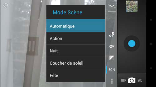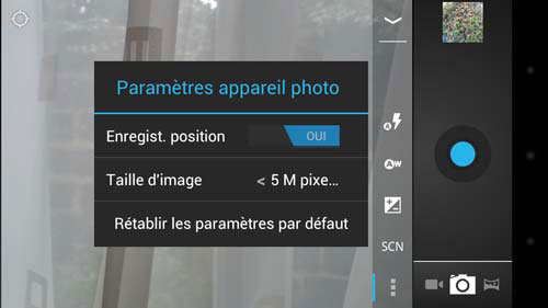 Les paramètres de réglages sont assez succincts. Ils apparaissent dans une barre latérale et permettent de gérer le flash, la balance des blancs, l'exposition, le mode de scène, la géolocalisation et enfin la taille de l'image avec plusieurs choix (5MP, 3MP, 2,MP, etc.). Tous les paramètres basiques sont là et il y a aussi une fonction panorama et quelques filtres colorés pour s'amuser un peu. Mais nous avons tout de même pris l'habitude de fonctions un peu plus évoluées avec les interfaces des constructeurs comme la reconnaissance de visage, de sourire, etc.