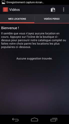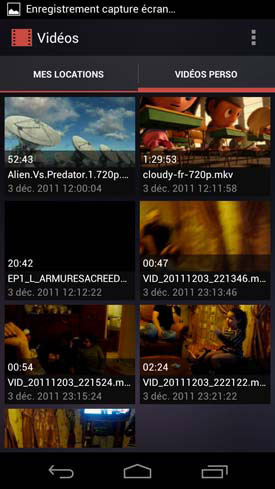 Une fois dans le lecteur, vous vous retrouvez sur un onglet « Mes Locations » qui ne sert à rien en France puisque Google ne propose pas chez nous de services de location de films. Il faut donc appuyer sur « vidéo persos » pour accéder à vos vidéos. Le lecteur en lui-même dispose d'une interface simple et classique. Le rendu des vidéos est absolument somptueux sur l'écran du Galaxy Nexus. Mais sa résolution est devenue tellement élevée que les vidéos de qualité moindre ont tendance à pixelliser.