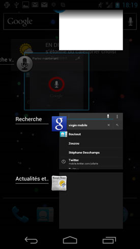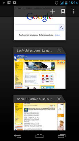 ICS fait table rase du passé en proposant désormais un superbe système, à la fois très graphique et diablement efficace. Une simple pression sur le bouton virtuel dédié fait apparaître l'ensemble des applications encore actives avec une représentation miniaturisée à la clé. Pour en supprimer une, et donc la fermer, il suffit de la faire glisser en dehors de la liste. Cela fonctionne avec la plupart des applications, mais il semble que certaines qui ne sont pas encore optimisées pour fonctionner avec ICS soient encore récalcitrantes à ce mode de fermeture. Gageons qu'il faudra quelques mois aux développeurs pour recompiler parfaitement leurs applications afin de les rendre totalement compatibles avec ICS et ses nouvelles manières.
