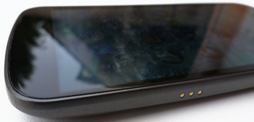 Android 4.0 oblige, la face avant est totalement lisse et ne comporte strictement aucun bouton, ni mécanique ni sensitif. En cas de notifications, une petite lumière en forme de disque se met à clignoter au milieu de la zone sous l'écran.