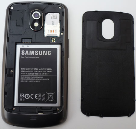 Le cache de la batterie occupe la majeure partie du dos de l'appareil. Il n'est pas difficile à enlever, mais beaucoup plus embêtant à remettre. Il faut en effet bien rentrer les petites pattes en plastique dans les emplacements correspondants. Et ce dans le bon ordre. Comme vous aurez tendance à avoir peur de forcer un peu vu le prix de l'appareil, vous allez vraiment tâtonner au départ. Il faut en fait d'abord enficher les pattes du bas, puis clipser les autres en remontant.