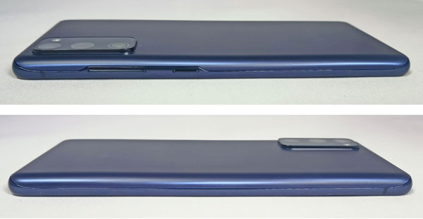 Afin de séduire un public aussi large que possible, le Galaxy S20 FE 5G est décliné avec une large palette de couleurs : bleu (très) foncé, lavande, menthe, rouge, blanc ou orange. Chacun pourra ainsi trouver le coloris qui lui convient. Son design est assez sobre. En effet, le mobile arbore des lignes arrondies sur les bords et un dos en plastique mat. Les traces de doigts y sont plutôt limitées. Ses profils sont en aluminium brillant, tranchant ainsi avec l’arrière. Nous avons testé la version bleue foncée, dont les bords sont presque noirs. La coque arrière revient vers les profils et on apprécie l’intégration des touches d’alimentation et de gestion du volume qui profitent d’un petit décrochage.