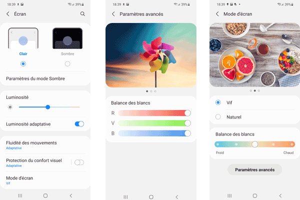 Il mesure 6,2 pouces en diagonale avec une définition de 1440x3200 pixels, mais qui peut être moindre si on veut économiser sa batterie. Idem pour la fréquence de rafraichissement qui peut être réglée sur 60 ou 120 Hz avec un mode adaptatif, le mobile réglant ainsi la meilleure fréquence, selon les besoins des applications et les ressources consommées. En outre, il est possible de modifier plusieurs détails afin d'ajuster la qualité de l?écran. Toutefois, celui-ci est très bien calibré en sortie d'usine et ne nécessite que des ajustements relatifs aux goûts de chacun. Les bords sont noirs, assez visibles, mais assez peu épais. Ils sont à peu près de la même épaisseur sur les deux côtés et au-dessus de l?écran, très légèrement supérieur sur le bord du bas. Les commandes gestuelles sont très agréables à produire sur cet écran plat.