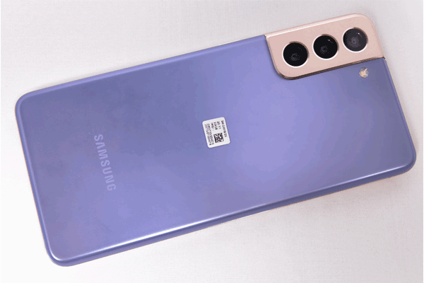 Le design du smartphone Samsung Galaxy S21 est assez remarquable. En effet, il profite de très belles lignes arrondies juste ce qu'il faut pour proposer une excellente prise en main. Il est décliné en plusieurs versions et nous avons pu tester le coloris violet avec les bordures dorées. Celles-ci relèvent particulièrement le mobile en lui conférant une touche de luxe, à la manière du Oppo Find X2 Pro, par exemple. Ici pas question de cuir, mais bien de plastique pour le dos du S21. Celui-ci est poli et traité anti-traces de doigt, plutôt efficace. C'est aussi le cas sur le Oppo Find X3 Pro. La coque arrière revient bien sur les bords. Il y a le fameux bloc optique souligné par une épaisseur dorée proposant trois objectifs de même diamètre strictement identiques bien que leurs capacités et caractéristiques respectives ne le soient pas. Juste à côté, il y a le flash, déporté.