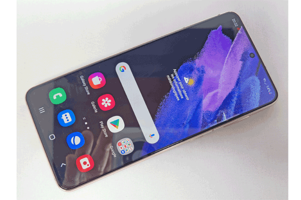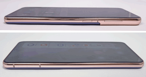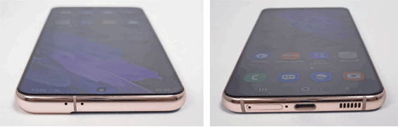 Il est plat à la différence du Galaxy S21 Ultra, le seul de la série à bénéficier d'un écran incurvé. Face au mobile, avec ses bords dorés et ses coins arrondis avec un certain angle, il fait penser à l'iPhone 12, mais peut-être en moins « strict » que le mobile à la pomme. L?écran est percé en haut au centre sous le haut-parleur.