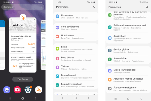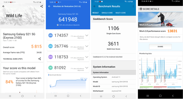 Pour fonctionner, le Samsung Galaxy S21 dispose d'une puce Samsung Exynos 2100 pour la version européenne gravée en 5 nm alors qu'il est équipé d'un Qualcomm Snapdragon 888 outre Atlantique aussi en 5 nm. Elle est associée à 8 Go de mémoire vive ce qui suffit finalement pour profiter d'une interface fluide et d'une excellente réactivité, quelle que soit l'application exécutée. Le passage de l'une à l'autre s'effectue très rapidement et nous n'avons pas constaté de saccade pendant toute notre phase de test. À titre de comparaison, le Xiaomi Mi 11 dispose d'une puce Snapdragon 888 avec 8 Go. Nous avons également pu jouer avec un maximum de détails et sans ralentissement. Le S21 s'est révélé un compagnon répondant toujours présent lorsqu'on en a besoin. Afin de comparer ses performances brutes avec d'autres modèles, nous l'avons soumis à plusieurs outils de mesure dont voici les principaux résultats.