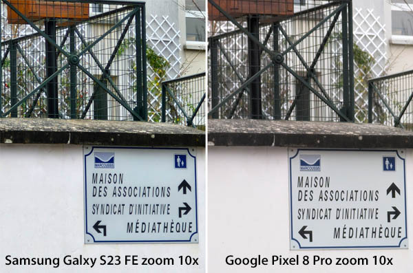 Pour les photos, le Samsung Galaxy S23 FE profite exactement du même capteur photo principal de 50 mégapixels avec stabilisation optique que les S23 et S23+. Il embarque également le même capteur ultra grand-angle de 12 mégapixels. Finalement, par rapport à ses aînés, notamment le Galaxy S23 et le Galaxy S23+, la différence sur les capteurs photo se fait au niveau du troisième module puisque celui-ci est un 8 mégapixels avec un zoom 3x contre 10 mégapixels sur les deux autres. Il est dépourvu de stabilisation optique. Toutefois à l’usage il faut dire que la stabilisation est plutôt tout à fait correcte. Très pratique : à partir du zoom 20x (en numérique), un petit cadre s’affiche automatiquement en haut à droite de l’interface permettant de savoir où l’on se trouve dans la scène.