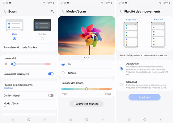 Bien évidemment, il y a un capteur qui mesure la luminosité ambiante pour ajuster automatiquement la luminosité de l’écran. Il est moins bien loti que le S23 Ultra avec son capteur de chaleur qui permet d’adapter les couleurs selon la teinte ambiante afin de limiter la fatigue oculaire, dans les options de Confort visuel au sein des paramètres. Il est ici possible de choisir entre le mode d’affichage Vif ou Naturel. Notez également la possibilité de jouer sur la température des couleurs pour obtenir une teinte plus froide ou plus chaude.