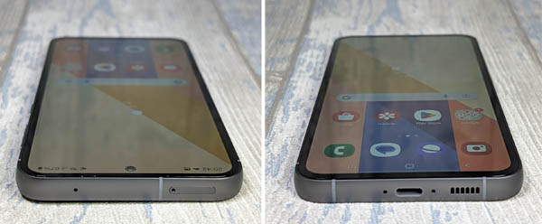 Les profils de l’appareil sont très légèrement bombés, sans excès, et permettent une excellente prise en main. On peut compter sur une épaisseur de 8,2 mm à comparer aux 6,6 mm de profil que font les Galaxy S23 et Galaxy S23+. Il s’agit d’une épaisseur relativement moyenne pour un smartphone de milieu de gamme. De manière très classique, le bouton de mise en veille est situé sur le profil droit juste en dessous du double bouton qui permet de gérer le volume. Sur le profil supérieur, il y a le tiroir à cartes SIM. Celui-ci est protégé contre les infiltrations d’eau et peut contenir deux cartes simultanément. Par contre, il est impossible d’insérer une carte mémoire afin d’étendre la capacité de stockage. Enfin, pour terminer avec les profils sur la tranche inférieure, il y a le connecteur USB-C encadré par deux microphones ainsi qu’un haut-parleur. Le châssis est en métal trahissant le caractère visible des antennes que l’on peut voir sur les contours de l’appareil.