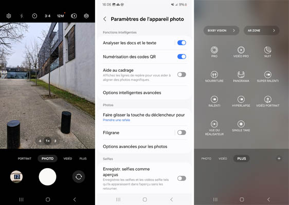 L’interface de l’application est très classique avec plusieurs options disponibles tout en haut de l’écran, la zone de cadrage, les niveaux de zooms (0,6x, 1x, 3x et 10x) immédiatement accessibles puis les modes de prises de vue (Portrait, Photo, Vidéo et Plus). Le menu Plus permet d’accéder à d’autres modes : Pro, Vidéo Pro, Nuit, Nourriture, Panorama, Super Ralenti, Ralenti, Hyperlapse, Vidéo portrait, Vue du réalisateur (double vue) et Single Take. Au niveau des modes de prise de vue il n’a donc rien à envier à ses contemporains. Il est possible de personnaliser l’interface avec des modes préférés.