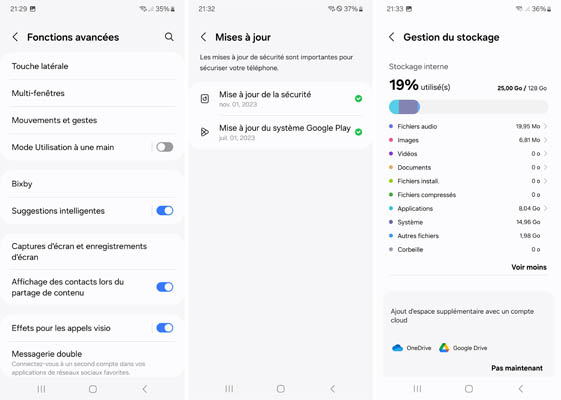 La quantité de mémoire interne utilisée par le système et la surcouche qui est ici plus raisonnable, car de 25 Go, que sur les autres modèles notamment le S23 Ultra qui demande 70 Go !...