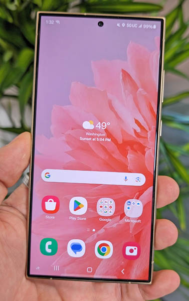 Ce qui surprend immédiatement à la prise en main de l’écran du Galaxy S24 Ultra, c’est l’absence quasi-totale de reflets sur celui-ci. Ainsi, même avec une lumière posée directement dessus, il arrive à en gommer les effets. Une véritable prouesse qui a son importance, notamment en extérieur et associé à la forte luminosité, l’utilisation du smartphone permet de profiter d’une très belle expérience.