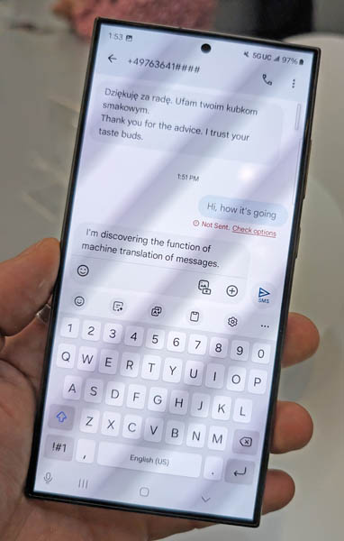 Il va nous falloir un petit peu de temps pour tester pleinement ses fonctionnalités, mais sachez que parmi elles on peut notamment trouver une option de traduction instantanée qui veut effacer les barrières linguistiques permettant ainsi de dialoguer avec des personnes dans d’autres pays et de voir sa conversation automatiquement traduite. Elle s’applique aux appels téléphoniques et offre ainsi une traduction bidirectionnelle en temps réel. La fonction Interprète traduit et retranscrit instantanément les conversations face à face. L’assistant message toujours aidé par l’intelligence artificielle et intégrer exclusivement au clavier Samsung aide les utilisateurs à formuler des messages, mais également à les traduire directement dans la langue du destinataire et inversement.