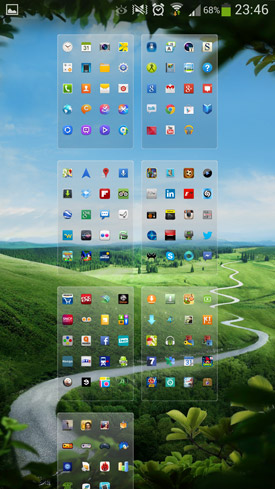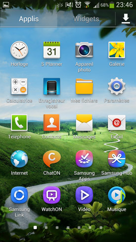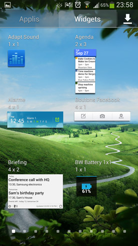 Comme toujours chez Samsung, l'interface utilisateur TouchWiz vient se superposer à celle d'Android, de sorte que l'interface graphique du système d'exploitation de Google est presque invisible aux yeux des utilisateurs. TouchWiz est ici présente dans sa version 5.0, estampillée Nature UX 2.0. Elle n?évolue pas beaucoup depuis celle que nous avions pu découvrir sur le Galaxy S3. Sa philosophie reste assez proche de ce que propose Google, avec des écrans d'accueil et un menu des applications. Nous n'allons pas revenir dessus en détail, car cette interface n'a pas vraiment changé depuis un moment. Elle est bien sûr plus jolie, profite de nouveaux effets graphiques, de nouvelles fonctionnalités mineures, de nouveaux widgets Samsung etc. Mais dans l'ensemble, le fonctionnement est identique.