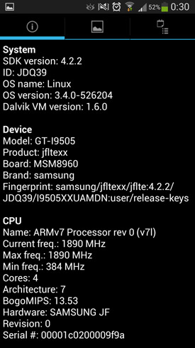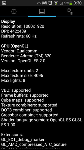 Il dispose donc d'un écran Super Amoled de 4,99 pouces, avec une résolution Full HD 1080p (1920 x 1080 pixels) si tendance en ce moment. Cela donne une densité de pixels par pouce assez délirante avec un score de 441. Les entrailles de l'appareil battent au rythme d'un chipset quadruple c'ur Qualcomm Snapdragon 600 (APQ8064T), dont les processeurs Krait 300 sont cadencés à 1,9 GHz et épaulé par 2 Go de mémoire vive (RAM). Pour la gestion des ressources graphiques, c'est une puce (GPU) Adreno 320 qui est à l??uvre. Pour diriger cet orchestre, on retrouve la toute dernière version d'Android (à date), la 4.2.2 Jelly Bean. Comme toujours, le constructeur a rajouté TouchWiz, sa propre interface utilisateur. Samsung entend se différencier de la concurrence en proposant un grand nombre de fonctionnalités basées par exemple sur les mouvements des yeux et sur des gestes. Nous y reviendrons plus loin dans le test.