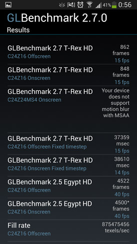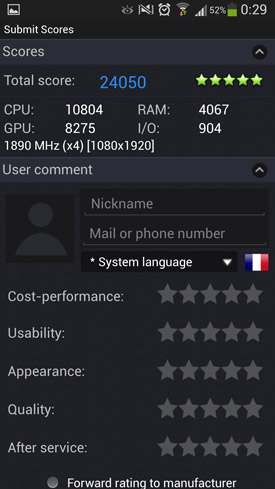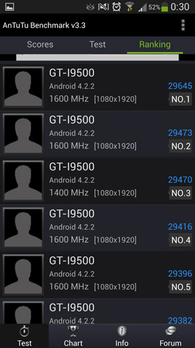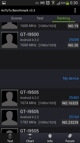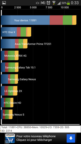 Enfin, terminons cette partie du test portant sur la réactivité du Galaxy S4 par quelques benchmarks. Comme évoqué à plusieurs reprises un peu plus haut, nous n'accordons pas vraiment de crédit à ces benchmarks, car ils ne traduisent en aucun cas ce que donnent les appareils en utilisation réelle. Mais certains d'entre vous, amis lecteurs, en êtes tout de même particulièrement friands. Nous créerons une nouvelle partie dans ce test lorsque nous aurons réussi à mettre la main sur la version du S4 embarquant le chipset Samsung Exynos 5 Octa. En attendant, voici les résultats pour celui sous Qualcomm Snapdragon 600.