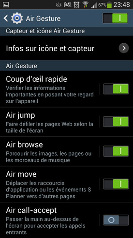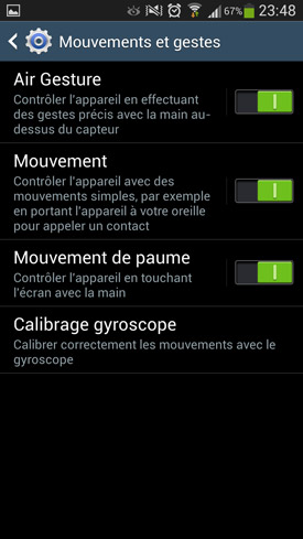 Enfin, le Galaxy S4 inaugure également une foule de nouvelles fonctionnalités basées sur les gestes (Air Gestures) et les mouvements, tout en améliorant d'autres déjà aperçus sur son prédécesseur, le Galaxy S3. Le test de cet ensemble très riche nous prend plus de temps que pour le reste, car il y en a vraiment beaucoup. Nous mettrons donc à jour ce test dès que possible afin de les commenter de manière exhaustive.