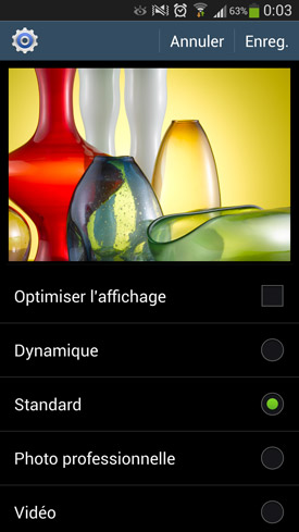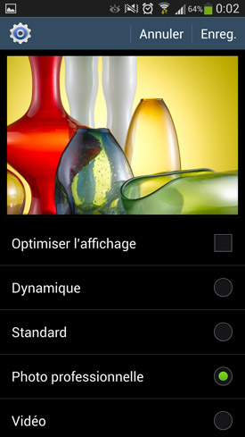 Côté rendu, la technologie Amoled a toujours été plébiscitée par le grand public. Toutefois, les puristes et autres professionnels de l'image lui ont toujours préféré le LCD de l'iPhone 5. La principale différence entre les deux tient au respect des couleurs. Ces dernières sont généralement saturées sur les Amoled, afin de flatter la rétine, quitte à ce que cela mène parfois à des aberrations colorimétriques. Toutefois, Samsung n'a eu de cesse de corriger ce défaut. Le constructeur a proposé dès le Galaxy S2 différents modes colorimétriques pour ajuster le rendu aux goûts de chacun. Sur le Galaxy S4, le coréen continue de creuser ce sillon. On retrouve un mode automatique pour optimiser l'affichage, et quatre autres modes « figés ». Parmi eux, un petit nouveau a fait son apparition, le mode « photo professionnelle ». Concrètement, il promet de procurer une image plus naturelle encore que le très bon mode vidéo du Galaxy S3. Dans les faits, nous n'avons pas vraiment réussi à établir de différence notable entre les deux, à l'exception du rouge un peu plus saturé en « photo professionnelle ». Ce qui ne signifie pas qu'ils sont de la poudre aux yeux, loin s'en faut. C'est plutôt que ces deux modes arrivent au même résultat, à savoir de donner à ce Galaxy S4 un rendu qui rivalise clairement avec celui des LCD pour ce qui est de la justesse des couleurs. Un véritable tour de force de la part de Samsung ! Pour ceux d'entre vous qui préfèrent les couleurs saturées à s'en arracher la rétine, habituellement caractéristiques de l?Amoled, il suffit de régler l'affichage sur les modes « Standard », « Dynamique » ou simplement de le laisser en automatique.