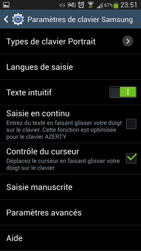 Pour le reste, le clavier en question est d'une redoutable efficacité. Et pour cause, même si ce n'est pas signalé directement dans le smartphone, on reconnait clairement la patte des auteurs de Swiftkey derrière ce clavier virtuel. Pour mémoire, cette application figure régulièrement à la première place des applications payantes dans la boutique Google Play. On ne la retrouve pas à l'identique dans le Galaxy S4, mais dans une version légèrement modifiée. Outre les touches numériques qui sont agencées comme évoqué plus haut, le système de prédiction est lui aussi un peu différent. Le remplacement des mots est ici désactivé par défaut. C'est d'ailleurs le seul point faible du clavier du Galaxy S4 car lorsqu'on l'active, il s'avère correct mais moins performant que Swiftkey. Avec ce dernier, les prédictions et remplacements s'améliorent au fil du temps. À tel point qu'au bout de quelques jours seulement, elles sont impressionnantes de précision et font gagner beaucoup de temps à l'utilisateur. Sur le Galaxy S4, la partie liée aux prédictions s'avère tout aussi excellente. On peut ici aussi demander au clavier d'aller apprendre les mots les plus utilisés depuis les comptes email, Twitter et Facebook du possesseur du smartphone. En revanche, comme évoqué plus haut, le remplacement automatique est moins précis que via Swiftkey. C'est donc à vous de voir si vous souhaitez l'activer ou pas.