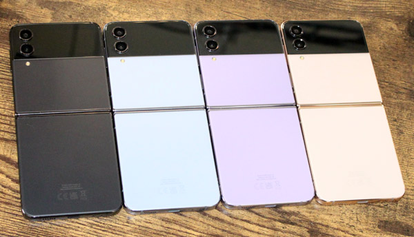Commençons par le design du nouveau smartphone pliant à clapet Samsung Galaxy Z Flip4. Celui-ci ne diffère pas beaucoup du Galaxy Z Flip3. Le fabricant a simplement réduit quelques côtes notamment au niveau de sa charnière qui est très légèrement plus fine (-1 mm) et la hauteur de l’appareil lorsqu’il est fermé aussi réduit de 1,5 mm. Le smartphone est décliné en quatre coloris : lavande, bleu clair, or rose et graphite. Il y a également une version personnalisable, exclusivement disponible sur le site samsung.com qui permet de choisir la couleur de la partie supérieure, celle de la partie inférieure et celle du châssis dont la charnière pour un total de 75 combinaisons différentes.