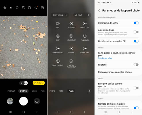 L’interface de l’application Appareil photo est très classique avec plusieurs options disponibles tout en haut de l’écran. Ensuite, il y a la zone de cadrage puis les modes 0,5x et 1x pour accéder immédiatement au capteur ultra grand-angle. Plusieurs modes sont accessibles : Portrait, Photo, Vidéo, Plus. Ce dernier menu permet d’accéder à d’autres modes : Pro, vidéo pro, single take, nuit, nourriture, panorama, super ralenti, ralenti, hyperlapse, vidéo portrait et vue du réalisation (double vue). Il est possible de personnaliser l’interface en ajoutant l’un de ces modes à ceux déjà disponibles sur la page principale de l’application. L’interface de l’application s’adapte lorsqu’on ouvre l’écran interne offrant une pleine vue s’il est totalement déplié ou proposant une vue seulement sur la partie haute de l’écran si celui-ci est légèrement replié faisant aussi basculer vers la partie basse les options normalement disponibles en haut. Pour activer l’écran externe et s’en servir comme zone de cadrage, il y a un bouton virtuel dans le coin supérieur à droite.