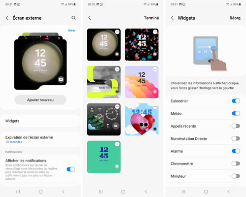 Un menu est dédié à l’écran externe. Il permet de personnaliser l’affichage externe et notamment celui de l’horloge en appliquant différents styles et fonds. Des modèles peuvent être choisis parmi une sélection. On peut gérer le délai d’affichage sans activité de l’écran externe entre 5 et 30 secondes. Les notifications peuvent y être affichées ou masquées. Enfin, une dernière rubrique permet de configurer des réponses rapides que l’on peut envoyer si on est occupé.