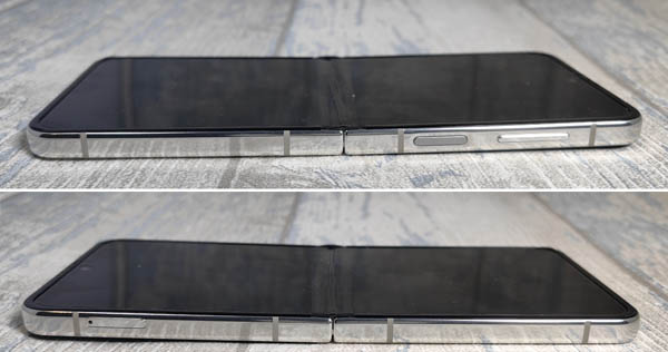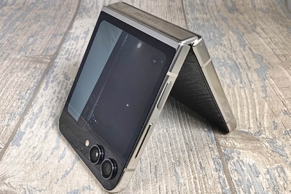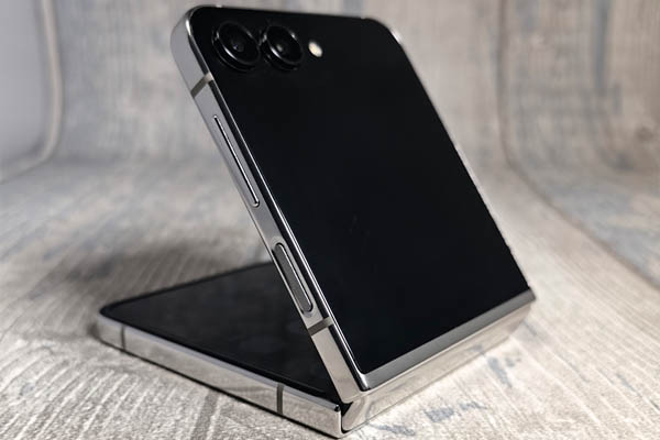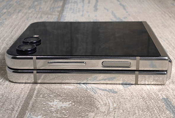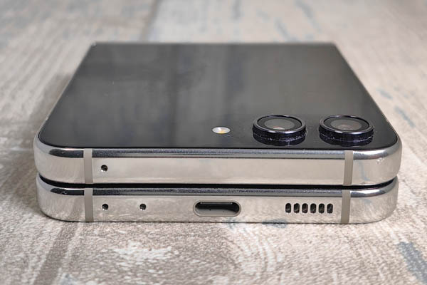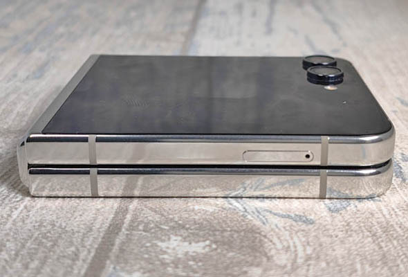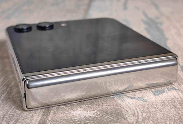 La grande différence avec le précédent modèle, le Galaxy Z Flip4, c’est le fait que Samsung ait revu sa charnière. Celle-ci permet maintenant aux deux volets d’être collés lorsque le mobile est fermé. Ce n’était pas le cas auparavant laissant un espace entre les deux ce qui provoquait l’accumulation de poussière. En termes de gabarit, le nouveau modèle possède des dimensions identiques ou presque au précédent. Les bords latéraux paraissent légèrement plus plats. Chromés, ils laissent les empreintes de doigts se poser et surtout rester dessus.
