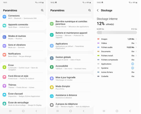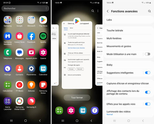 Plusieurs applications sont préinstallées dont celles de Microsoft (Office, OneDrive, LinkedIn et Outlook) et celles de Google. Facebook et Spotify font aussi partie des applications que l’on trouve immédiatement lors de la première utilisation du smartphone. Bien entendu, Samsung propose également ses applications dont Galaxy Shop, SmartThings, Samsung Health, Samsung Pay, Bixby, AR Zone, Samsung TV Plus, Galaxy Wearable ou encore Smart Switch pour passer rapidement d’un mobile à un autre en y copiant les données. Les paramètres sont nombreux pour organiser et gérer le mobile. Ils sont bien organisés et un moteur de recherche permet de trouver l’option désirée.