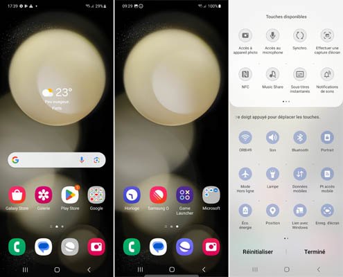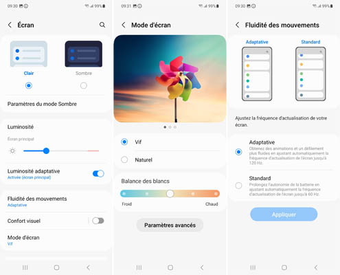 Pour l’affichage, les paramètres proposent les modes de couleurs vif et naturel. Il est possible de jouer sur la balance des blancs pour obtenir une teinte plus chaude ou plus froide. Les réglages proposés par défaut sont tout à fait satisfaisants sur l’appareil que nous avons pu tester. Sa luminosité est suffisante pour s’en servir en extérieur et dans la pénombre, il ne provoque pas de fatigue oculaire. Officiellement, Samsung annonce une luminosité maximale de 1750 cd/m², comme le Galaxy S23 Ultra.