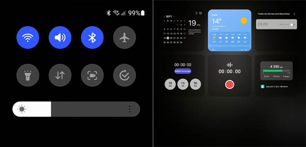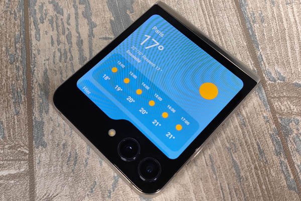 Avec la nouvelle charnière qui permet aux deux volets de se coller, le grand écran externe est la deuxième modification physique majeure pour ce nouveau modèle. Il s’agit d’un écran AMOLED qui propose une diagonale de 3,4 pouces. Tactile, il affiche l’heure et s’anime après deux tapes rapides. On peut alors faire défiler les widgets installés pour afficher le lecteur de musique, les alarmes, l’enregistreur vocal, le minuteur, le calendrier, la météo, le programme du jour, le nombre de pas, des contacts ou des raccourcis vers les objets connectés enregistrés au sein de l’application domotique SmartThings de Samsung.