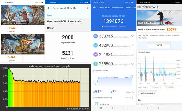 Le Galaxy Z Flip5 est doté de la puce Qualcomm Snapdragon 8 Gen 2 For Galaxy comme le Galaxy S23, le Galaxy S23 Plus, le Galaxy S23 Ultra et le Galaxy Z Fold5. Elle est associée à 8 Go de mémoire vive sans possibilité d’aller plus loin ce que proposent certains modèles chez realme, Vivo, Honor, Motorola ou Oppo, par exemple. Toutefois, cela suffit dans tous les cas, car le chipset permet de profiter d’une très belle expérience logicielle. En effet, la puissance est largement suffisante pour bénéficier d’une interface fluide, de lancement des applications dans un délai très court et de pouvoir passer de l’une à l’autre en un instant. Nous n’avons constaté aucune saccade lors de nos tests. À noter que l’appareil peut chauffer légèrement lorsqu’il est soumis à rude épreuve pendant qu’il s’agissait de tester ses performances brutes. Aucun jeu ne lui résiste et là aussi, l’expérience ludique est très satisfaisante autorisant le jeu des titres les plus gourmands en ressources avec une grande fluidité et une très bonne jouabilité.