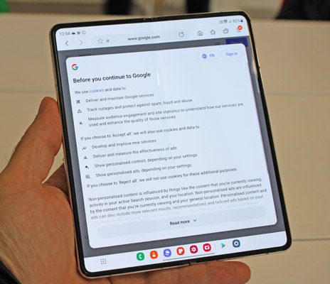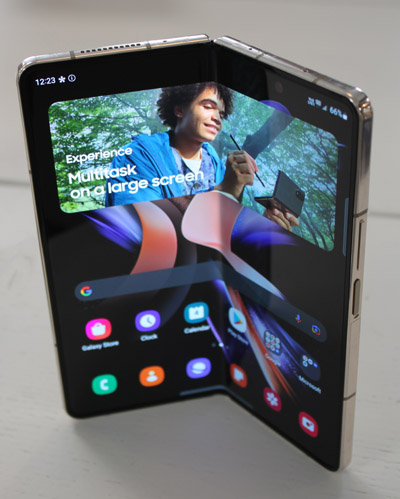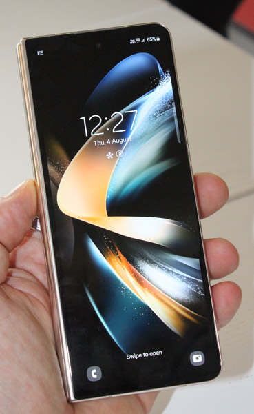 Lorsque le mobile est complètement ouvert, on peut apprécier l’écran interne qui est très grand et permet de profiter d’une large surface d’affichage. Les bordures sont légèrement plus petites que sur le précédent modèle. On note immédiatement que le pli au milieu est toujours aussi visible que sur le Galaxy Z Fold3 et qu’on le sent également lorsqu’on passe le doigt dessus. On cherche ensuite la caméra sous l’écran qui est installée sur le volet de droite.
