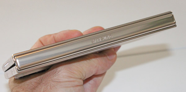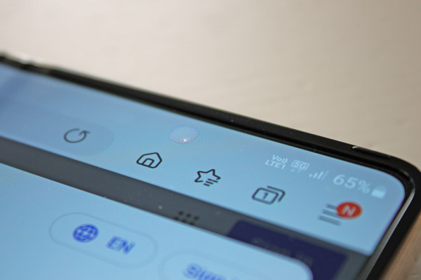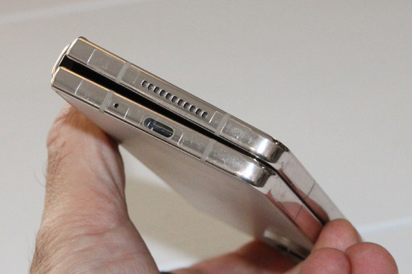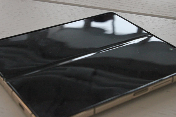 Immédiatement, on la repère, surtout sur un fond d’écran clair ou une interface blanche. Samsung nous dit avoir augmenté la densité de pixels au-dessus du capteur pour qu’il soit moins visible mais ce n’est pas une réussite. Avec des fonds plus sombres, on ne la voit pas. Concernant la qualité des selfies, il nous faudra juger lors d’un test plus complet. Toutefois, le constructeur conseille, pour réaliser des selfies, d’utiliser plutôt les capteurs installés au dos de l’appareil puisqu’une fois totalement ouvert, on peut se servir de l’écran externe pour cadrer et obtenir, à coup sûr, la meilleure qualité possible avec ce smartphone.