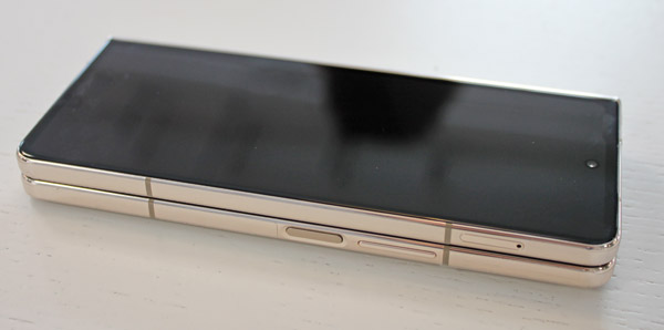 Comme sur le Galaxy Z Flip4, le Galaxy Z Fold4 profite d’une charnière plus fine. De la même manière que son prédécesseur mais aussi des Z Flip3 et Z Flip4, il y a un espace relativement important à la base de la charnière au niveau de l’écran ce qui fait que les deux volets se touchent uniquement à l’extrémité. C’est pour cette raison que le Galaxy Z Fold4 est certifié IPX8, donc protégé non pas contre la poussière mais seulement contre l’eau douce. Le poids de l’appareil est légèrement réduit passant de 271 grammes à 263 grammes. Le lecteur d’empreinte digitale est toujours installé sur le profil.