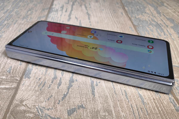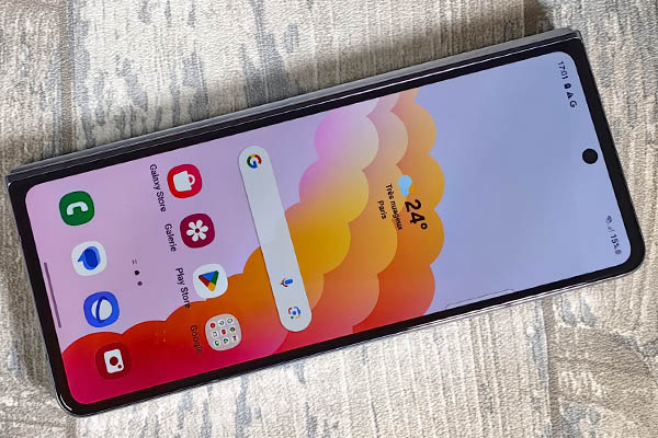 Le Galaxy Z Fold5 propose un écran externe de 6,2 pouces en diagonale. Il utilise une dalle AMOLED ave une définition de 904x2316 pixels. Il a des bords qui sont assez fins bien que nous ayons vu mieux sur d’autres appareils. Malgré cela, il est parfaitement possible de se servir du téléphone uniquement avec cet écran tout en hauteur. L’idée est lorsqu’on a besoin d’un affichage plus large ou d’afficher deux applications simultanément, on ouvre le mobile pour se servir du second écran, interne. L’écran externe profite d’une fréquence de 120 Hz maximum (minimum 48 Hz) et offre donc des défilements fluides aussi bien pour parcourir les pages de sites Internet que les murs des réseaux sociaux ou dans les jeux.