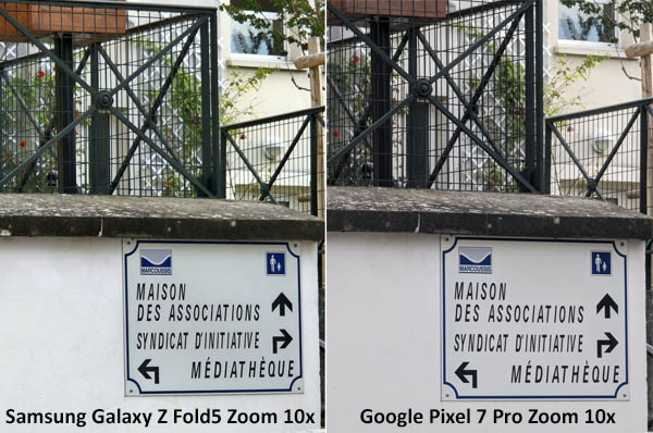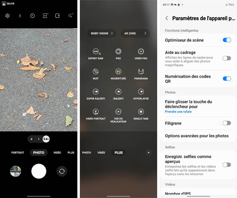 Pour la partie photo, sur le papier, il s’agit de la même configuration de capteurs que sur le précédent modèle, le Galaxy Z Fold4 soit un capteur principal de 50 mégapixels avec un capteur ultra grand-angle de 12 mégapixels et un téléobjectif de 10 mégapixels capable de zoomer jusqu’à 3x optiquement. L’interface de l’application Appareil photo est très classique avec plusieurs options disponibles tout en haut de l’écran. Ensuite, il y a la zone de cadrage puis les modes 0,5x et 1x pour accéder immédiatement au capteur ultra grand-angle. Les zooms sont positionnés sur la partie gauche de l’écran si on utilise la surface d’affichage interne. Plusieurs modes sont accessibles : Portrait, Photo, Vidéo, Plus. Ce dernier menu permet d’accéder à d’autres modes : Expert RAW, Pro, vidéo pro, nuit, nourriture, panorama, super ralenti, ralenti, hyperlapse, vidéo portrait, vue du réalisation (double vue) et single take. Il est possible de personnaliser l’interface en ajoutant l’un de ces modes à ceux déjà disponibles sur la page principale de l’application.