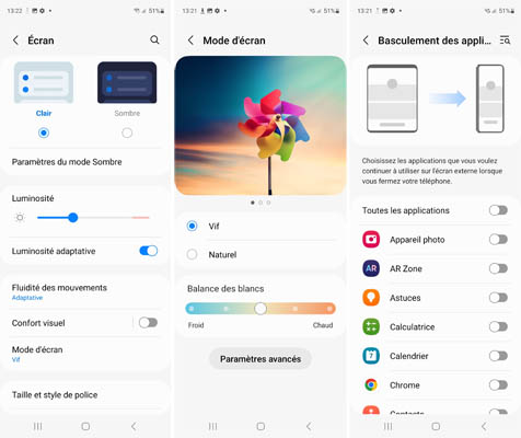 L’écran interne du smartphone est d’excellente qualité proposant une parfaite lisibilité ainsi qu’une luminosité suffisante pour un usage en extérieur. Il y a deux modes d’affichage : Vif et naturel et on peut jouer sur la balance des blancs. Les réglages proposés par défaut sont tout à fait satisfaisants sur l’appareil que nous avons pu tester. L’écran est protégé par un film. Rappelons qu’il est compatible avec le stylet Samsung S Pen pour dessiner ou prendre des notes.