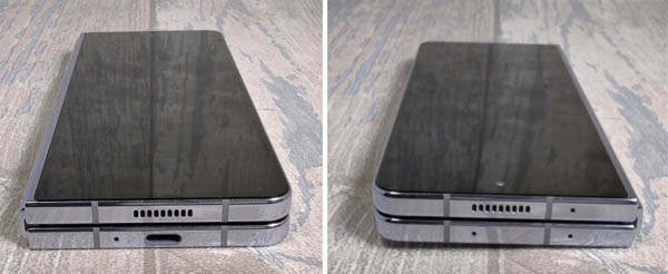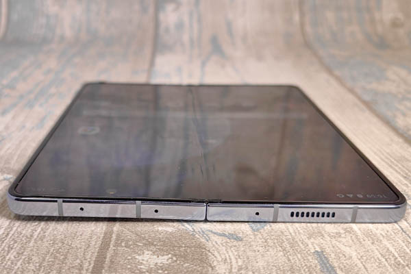 Au niveau des dimensions, le Galaxy Z Fold5 fait 154,9 mm de haut contre 155,1 mm pour le Galaxy Z Fold4. Il a une largeur de 67,1 mm lorsqu’il est fermé, comme son prédécesseur et mesure presque 130 mm de largeur lorsqu’il est totalement ouvert. Le Galaxy Z Fold5 est très légèrement plus fin avec un profil de 6,1 mm ouvert contre 6,3 mm pour le Galaxy Z Fold4. Fermé, il a un profil de 13,4 mm contre 14,2 mm pour son prédécesseur. Notez un poids inférieur de 10 grammes soit 253 grammes pour le Galaxy Z Fold5. L’appareil est officiellement certifié IPX8 donc totalement étanche à l’eau, mais pas à la poussière.
