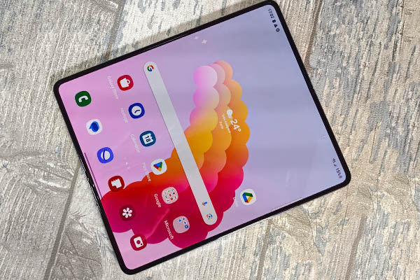 Ouvert, de face et avec un fond clair, on ne voit quasiment pas la pliure au centre. On la voit lorsqu’on se décale un peu sur la gauche ou sur la droite. Au toucher, on sent une légère pliure, mais cela reste tout à fait acceptable. En haut, au centre du volet de droite, il y a une caméra sous l’écran qui embarque un capteur de 4 mégapixels, comme sur le Galaxy Z Fold4. On peut afficher jusqu’à 3 applications simultanément.