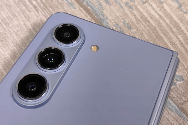 Le design du smartphone Galaxy Z Fold5 reprend les grandes lignes de son prédécesseur, le Galaxy Z Fold4. En effet, il se présente sous la forme d’un livre que l’on peut ouvrir grâce à une charnière verticale. Celle-ci a été retravaillée pour moins blesser l’écran, au centre, au niveau de sa pliure en proposant une forme de goutte d’eau. Cette structure permet également de faire parfaitement coller les deux bords du mobile lorsqu’il est totalement refermé, ce qui n’était pas le cas sur le précédent laissant quelques millimètres à la poussière pour s’y introduire. La charnière est brillante, reprenant presque le coloris du reste de l’appareil. Le Galaxy Z Fold5 est décliné en noir, crème ou bleu. C’est cette version que nous avons pu tester. Toutes les déclinaisons profitent d’un revêtement anti-traces de doigts, très efficace, à l’arrière. Sur cette surface, il y a également les capteurs photo qui sont tous logés dans le coin supérieur à gauche, sur une plaque qui reprend le coloris. Les objectifs dépassent légèrement, comme sur le précédent modèle. Les finitions sont exemplaires et le modèle prêté par la marque pour réaliser ce test ne souffrait d’aucun défaut de fabrication.