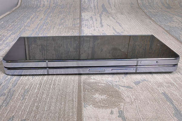 Si on fait le tour du smartphone, fermé, il y a le bouton de mise en veille sur le profil qui intègre le lecteur d’empreinte digitale. Juste au-dessus, il y a le double bouton pour gérer le volume. Sur l’autre volet, il y a l’emplacement pour les cartes SIM. Le mobile peut accepter deux cartes SIM et supporte la technologie eSIM, le cas échéant. Il n’est malheureusement pas possible d’insérer une carte mémoire micro SD pour augmenter la capacité de stockage interne.