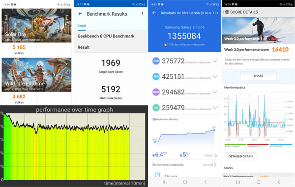 Pour fonctionner, le Galaxy Z Fold5 embarque un chipset Qualcomm Snapdragon 8 Gen 2 For Galaxy comme les Galaxy S23, Galaxy S23 Plus et Galaxy S23 Ultra. Rappelons qu’il s’agit d’une puce spécialement optimisée pour les mobiles de la marque. Ce Soc délivre d’excellentes performances pour l’appareil qui réagit de manière particulièrement prompte. Il lance les applications extrêmement rapidement et permet de passer de l’une à l’autre en un instant. Ce processeur est aidé par 12 Go de mémoire vive. Il n’y a pas de possibilité pour ajouter de la mémoire vive de manière virtuelle, comme sur d’autres mobiles de la marque, par exemple. Toutefois, il y a déjà de quoi faire avec la configuration proposée.