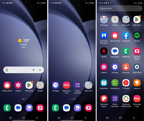 Il est possible de faire un lien avec un ordinateur sous Windows. Plusieurs applications sont préinstallées dont celles de Microsoft (Office, OneDrive, LinkedIn et Outlook) et celles de Google. Facebook, Spotify et Netflix font aussi partie des applications que l’on trouve immédiatement lors de la première utilisation du smartphone. Comme sur les autres modèles de la marque, Samsung propose également ses applications dont SmartThings, Samsung Health, Samsung Pay, Bixby, AR Zone, Samsung TV Plus ou encore Smart Switch pour passer rapidement d’un mobile à un autre en y copiant les données.