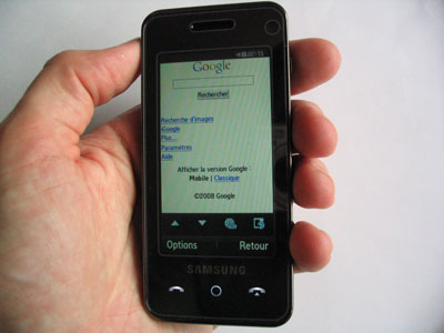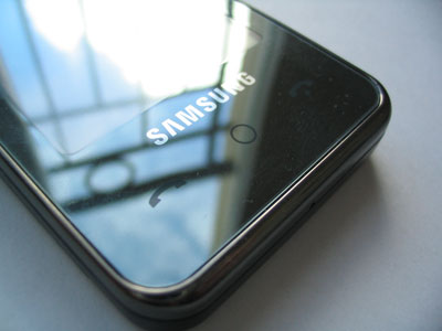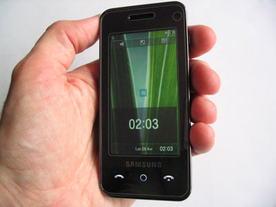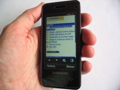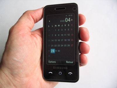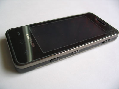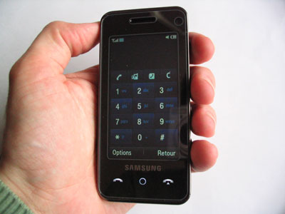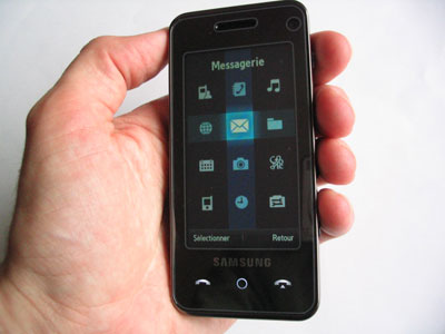 Le superbe écran de 3,2 pouces occupe la majeure partie de la face avant. Le reste est dévolu à trois touches sensitives situées juste sous l'écran. Elles ajoutent encore à la splendeur de l'appareil par leur platitude. C'est bien simple, rien ne dépasse de la face avant du F490 ! Par contre, comme pour tous les mobiles tactiles récents, le Player est très sensible aux traces de doigts. On pourrait reprocher à Samsung de ne pas avoir fourni de chiffon dans la boîte mais on s'aperçoit vite que la housse est faite d'une matière douce, idéale pour essuyer le mobile.