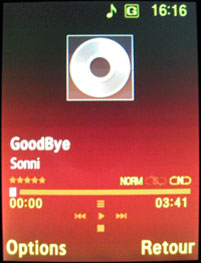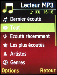 Mention spéciale pour le lecteur MP3 de très bonne qualité. En plus de fournir un son clair et puissant, l'interface et les fonctionnalités du baladeur intégré sont vraiment très réussies. Il dispose d'une bibliothèque musicale qui garde en mémoire tout ce que votre téléphone compte de chansons. Les formats audio compatibles sont MP3, WMA, AAC, AAC+ et eAAC+.