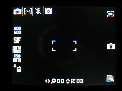Passons maintenant à la fonction multimédia phare de ce téléphone : la photo. Quand vous coulissez le slider pour libérer l'optique embarquée, Samsung précise fièrement « 5 MEGA » en petites lettres argentés, entre le capteur et le flash. Le SGH-G600 serait en théorie capable de rivaliser avec un appareil photo numérique datant de deux ans. Il propose même un autofocus et un stabilisateur d'image !